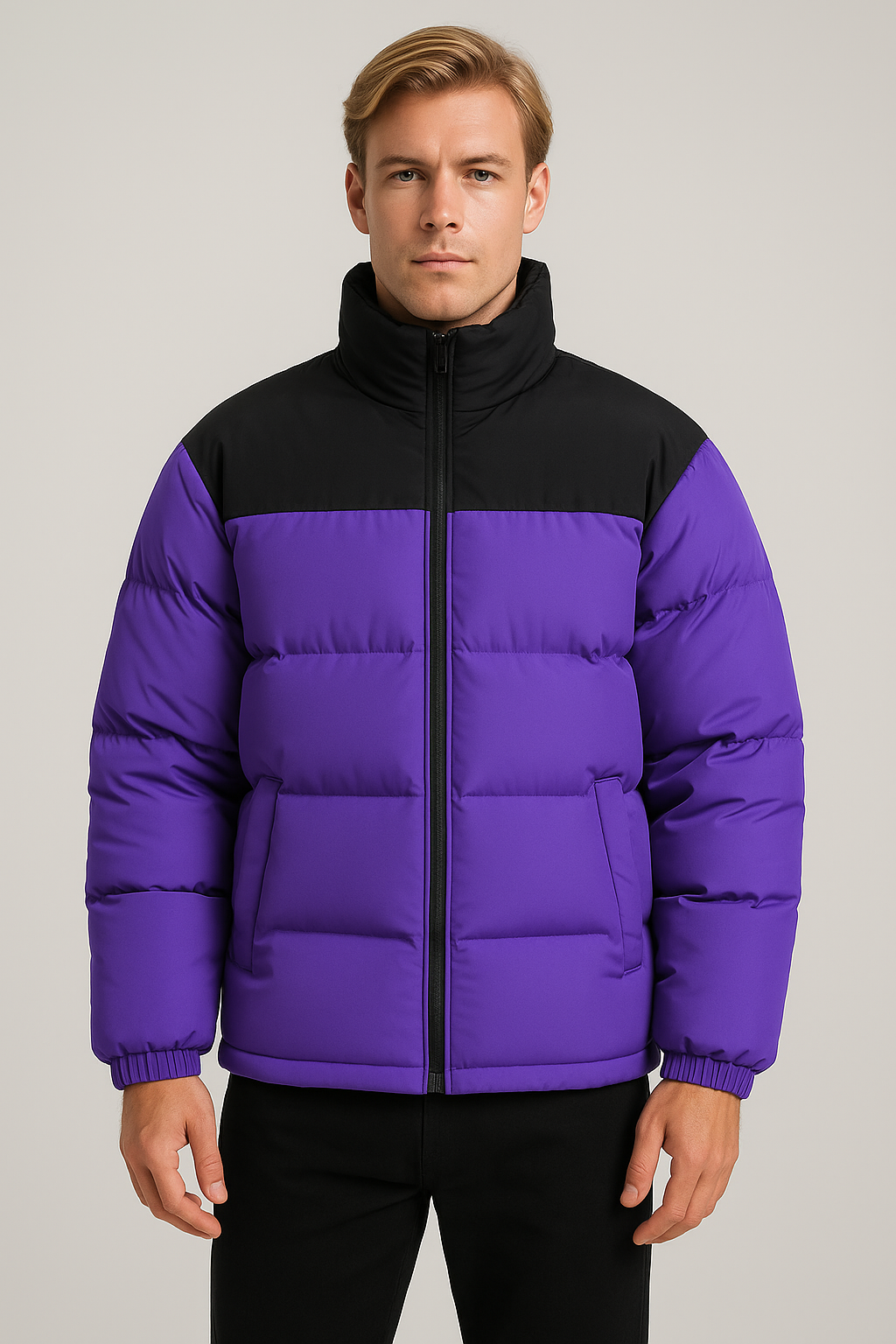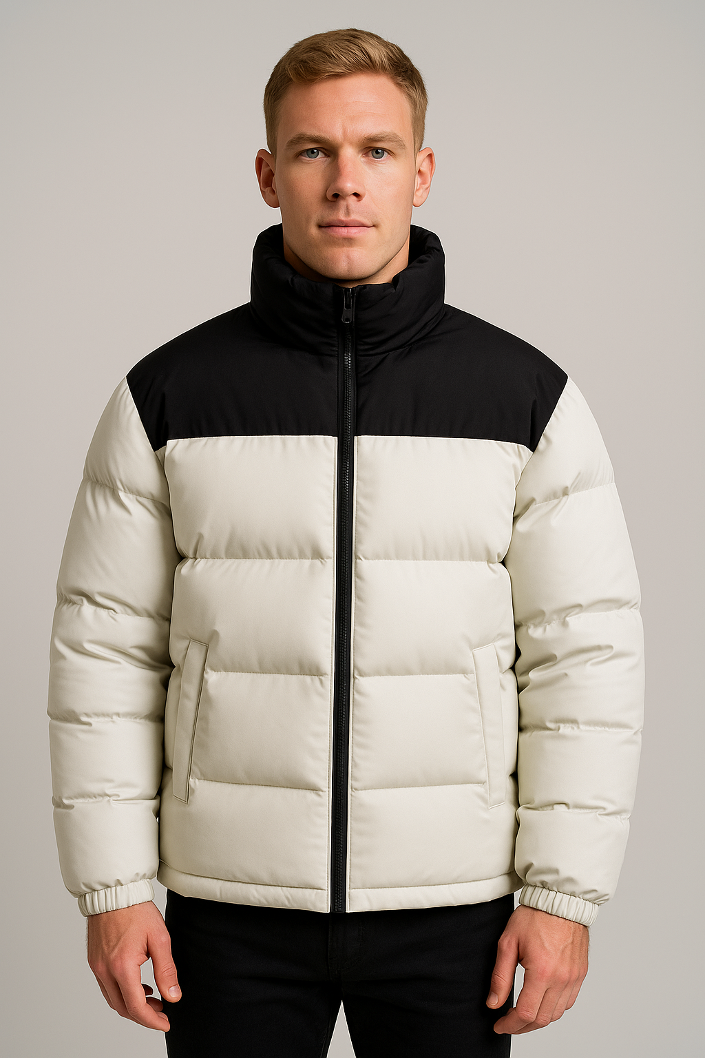 Stay warm and fashionable this winter with our black and white colorblock puffer jacket for men. This jacket features a modern silhouette that combines bold contrast with practicality, making it a perfect addition to your cold-weather wardrobe. The thick padding ensures reliable insulation, while the full zip closure and elastic cuffs effectively block out the chill. Ideal for city outings or weekend adventures, this jacket effortlessly enhances any winter outfit.