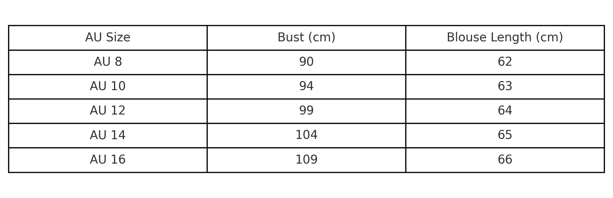 Our sizes are in Australian sizes, so please check the size chart for reference. If you're unsure or between two sizes, we recommend choosing the larger size.