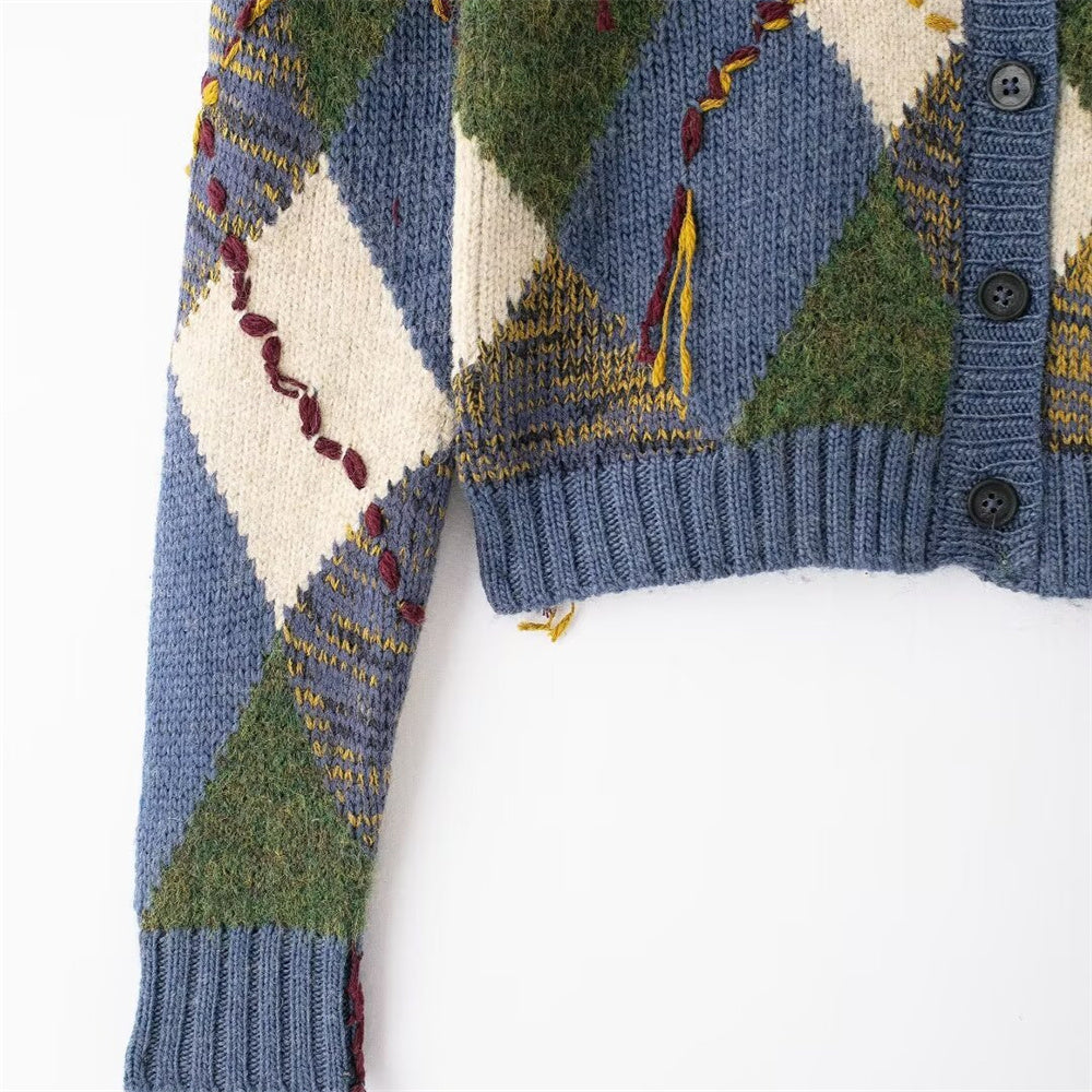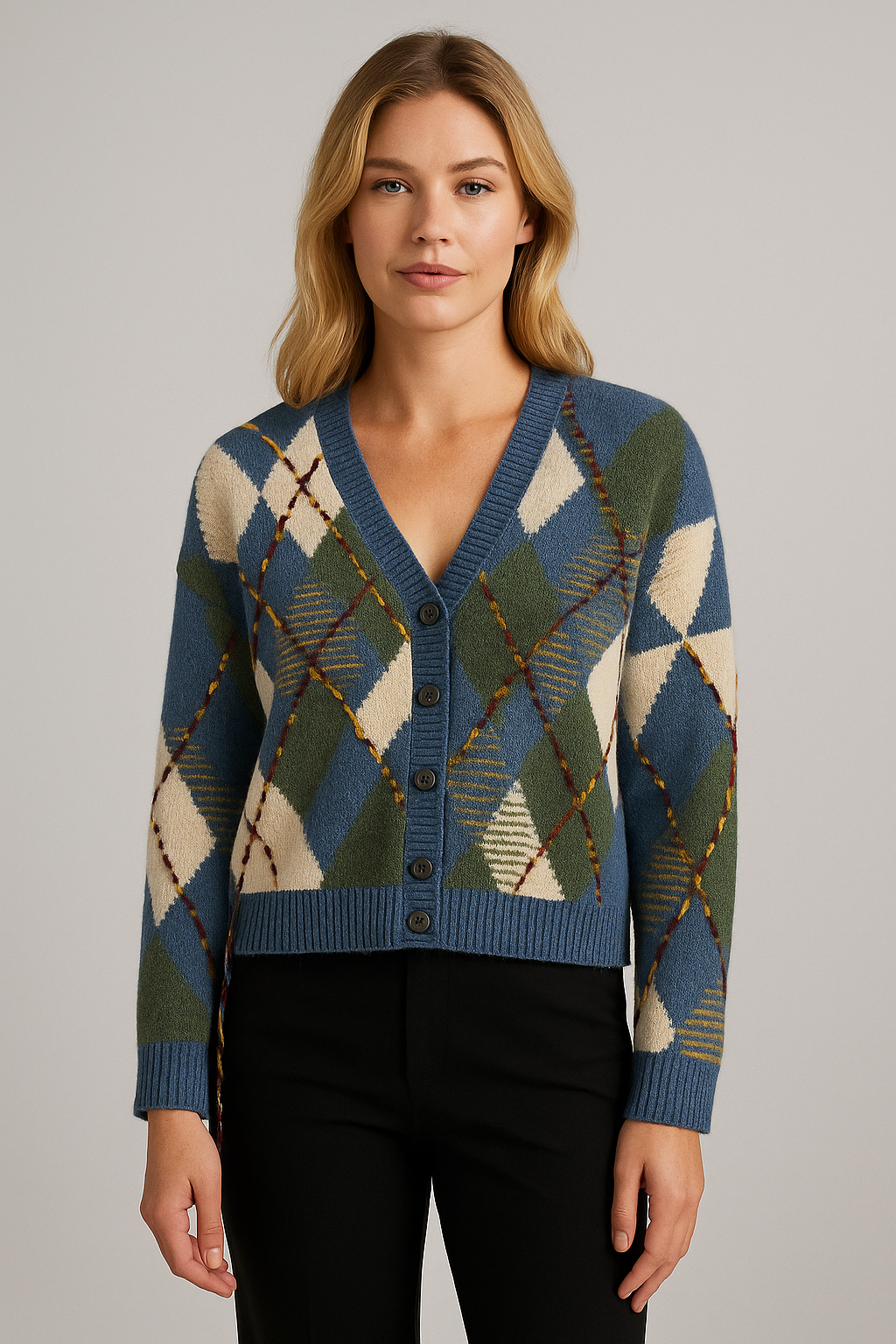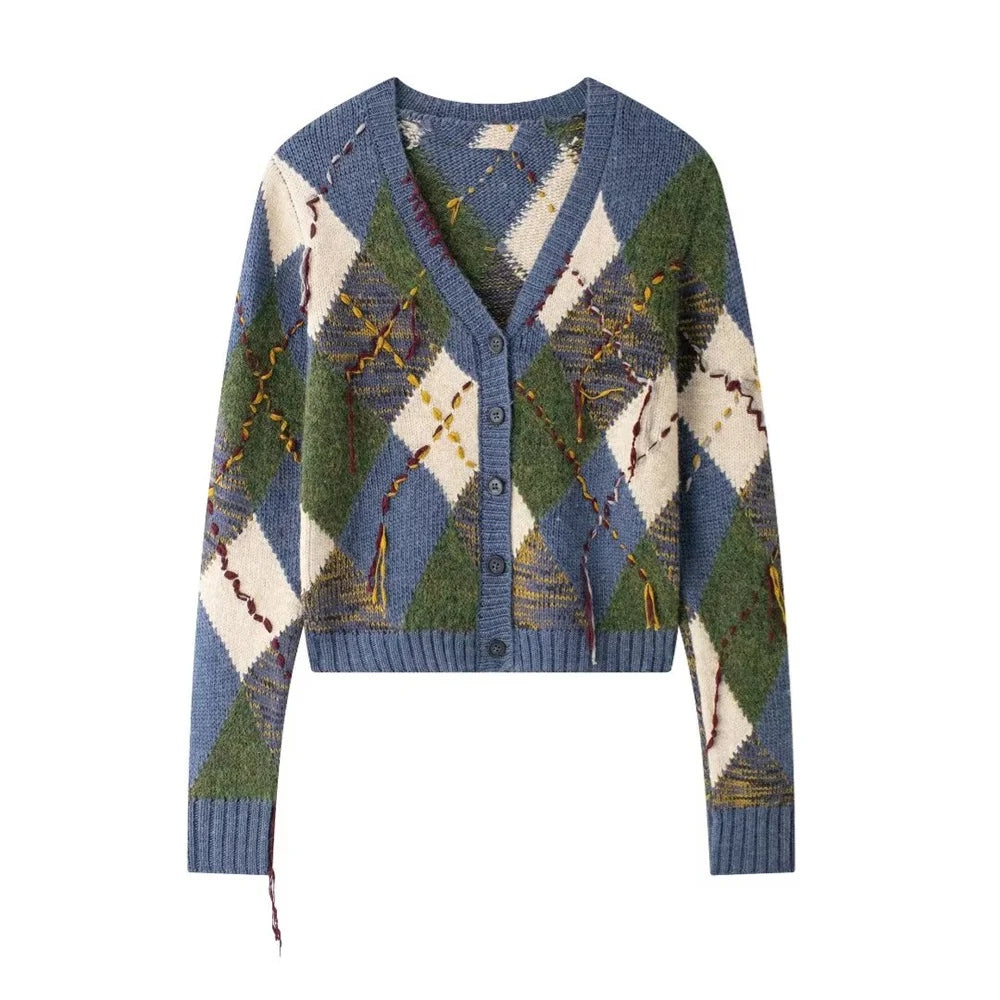 This women's long sleeve knitted jacket features a chic V-neck design and a trendy diamond pattern. Perfect for autumn, it combines comfort with a stylish look, making it ideal for both casual outings and business settings. The contrasting colors add a modern touch, ensuring you stand out while feeling at ease.
