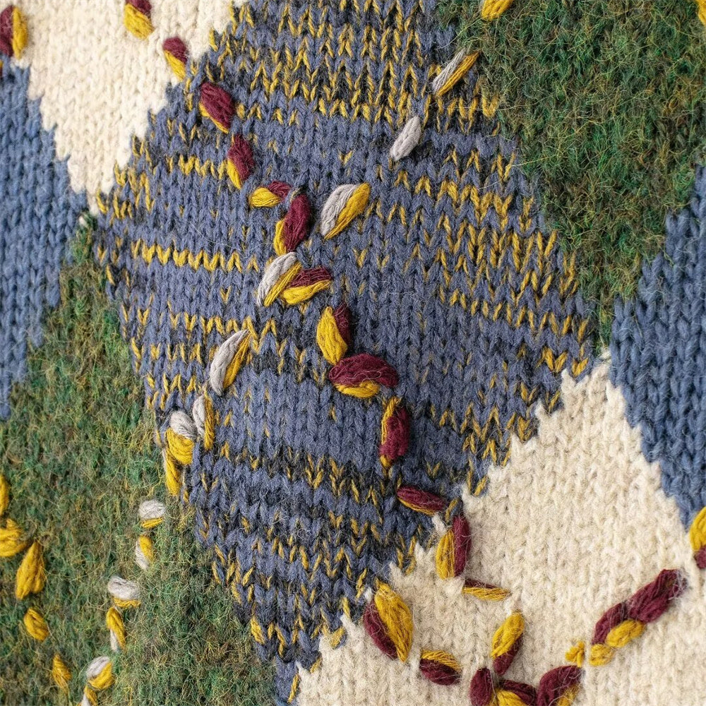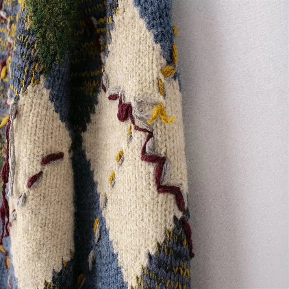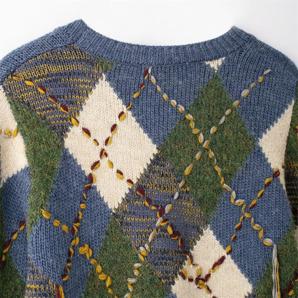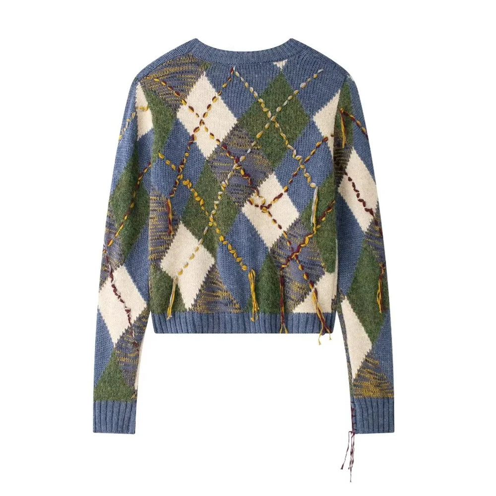 This women's long sleeve knitted jacket features a chic V-neck design and a trendy diamond pattern. Perfect for autumn, it combines comfort with a stylish look, making it ideal for both casual outings and business settings. The contrasting colors add a modern touch, ensuring you stand out while feeling at ease.