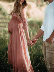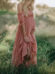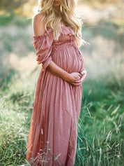 This flowy off-shoulder maxi maternity dress is designed for expecting mothers who want to blend style with comfort. Made from lightweight fabric, it offers a loose fit that is perfect for various occasions, from casual outings to special events.